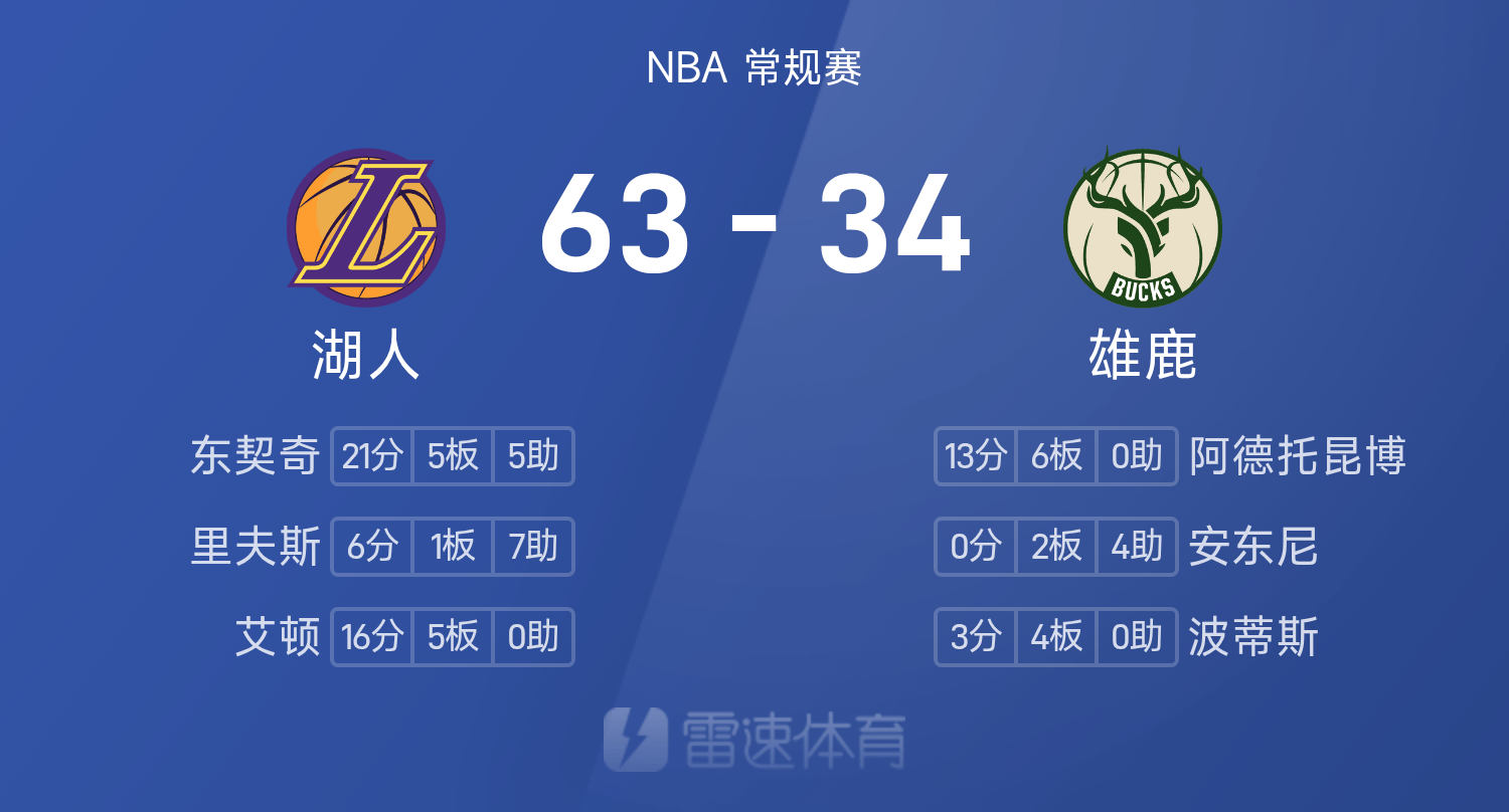 双方目前半场战罢,雄鹿34-63跟跑位湖人29分。