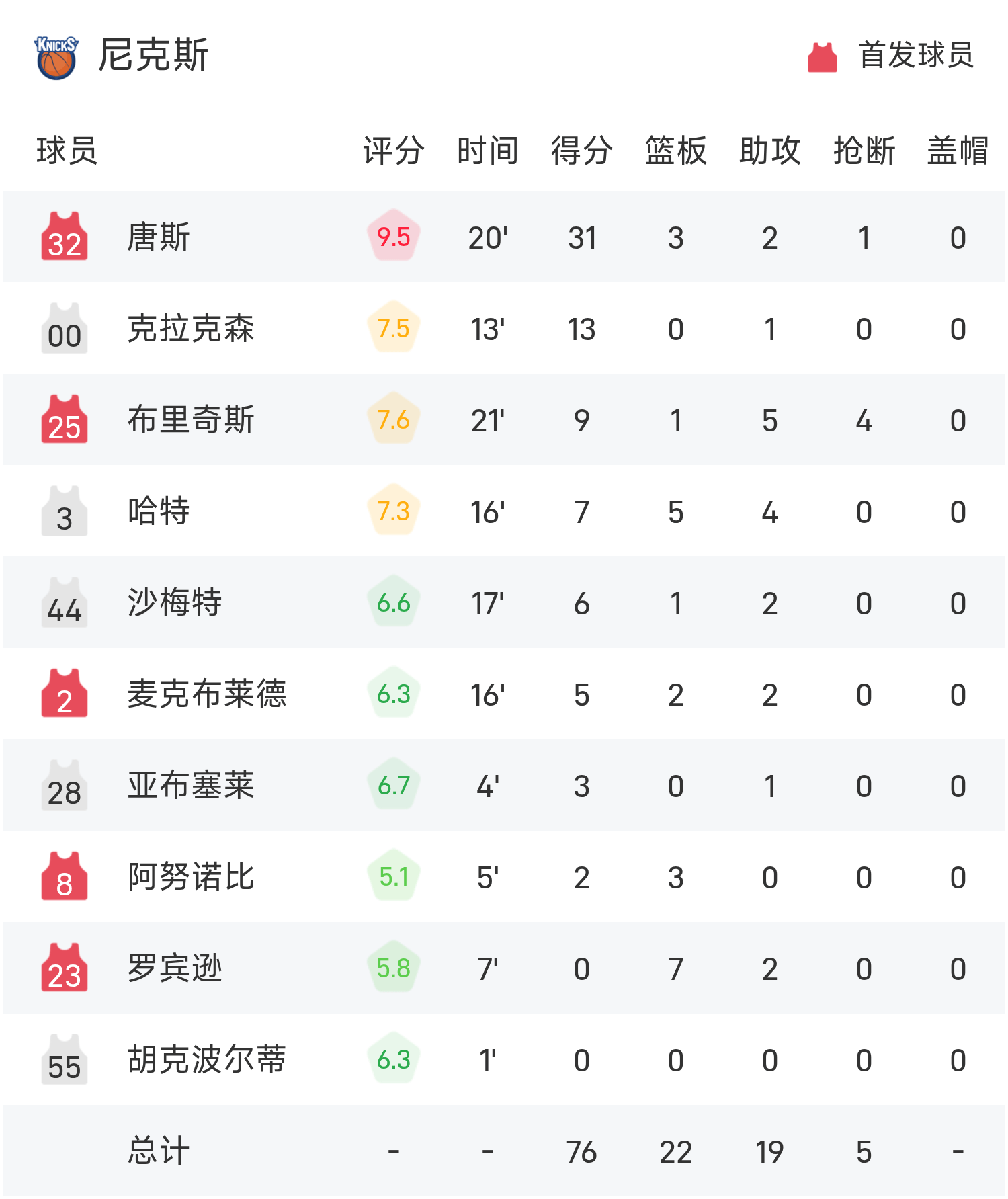 NBA半场:唐斯31分,阿努诺比伤退,尼克斯78-68热火