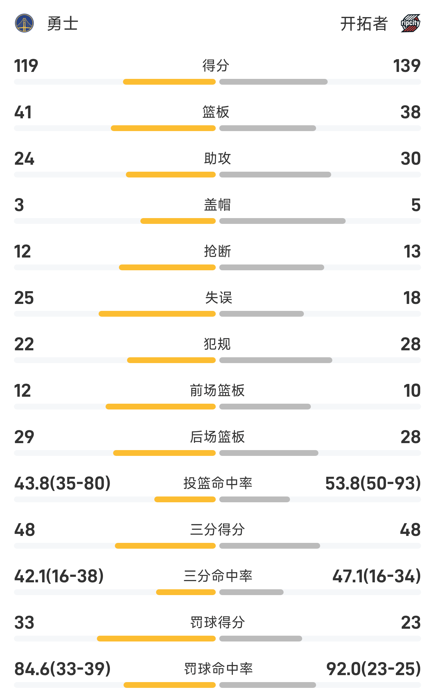 6686体育10月25日讯 25/26赛季NBA 常规赛,开拓者对阵勇士。双方全场战罢,开拓者139-119战胜勇士。阿夫迪亚得到26分5板6助率队取胜,库里空砍全场最高的35分6板3助。