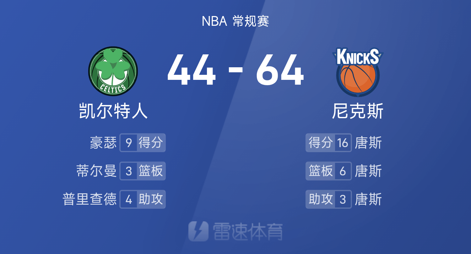 6686体育平台10月25日讯 25/26赛季NBA 常规赛,尼克斯对阵凯尔特人。双方半场战罢,尼克斯64-44领跑位凯尔特人。