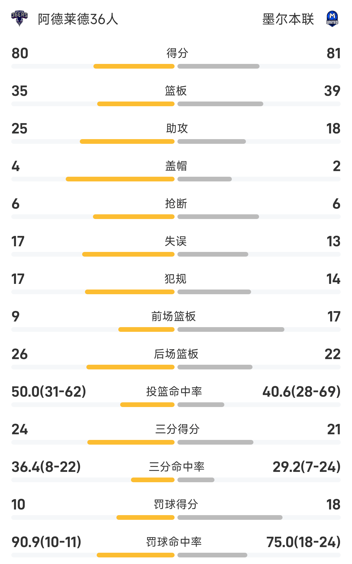 双方全场战罢,墨尔本联81-80战胜阿德莱德36人。
