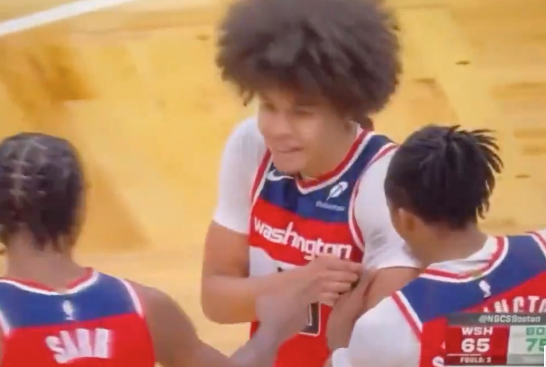 值得一提的是,赛后美媒Basketball Forever晒出了本场竞赛的一个小插曲:杰伦·布朗在一次攻击中撞翻了凯肖恩·乔治,布朗的发际线粉直接蹭到了乔治的白色紧身衣上。