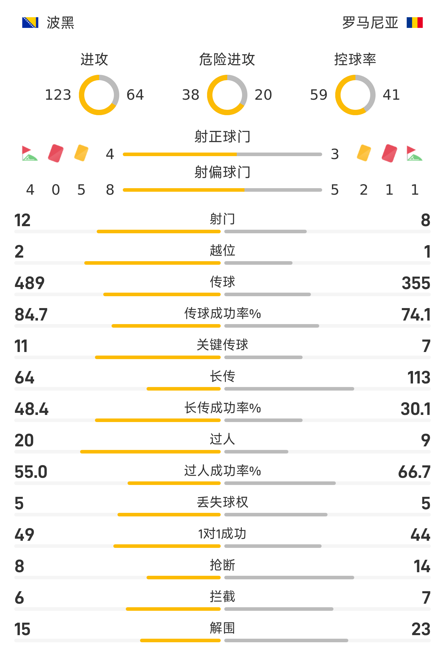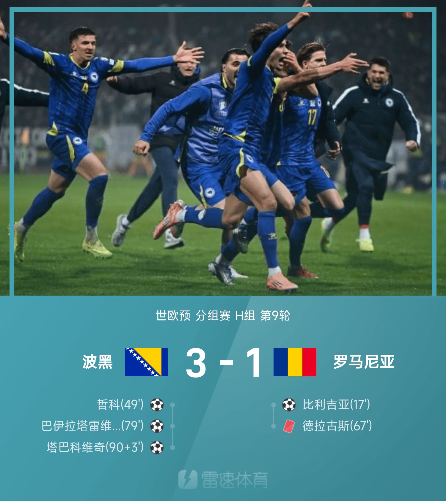 6686体育平台11月16日讯 26赛季世欧预分组赛H组第9轮,波黑坐镇主队场迎战罗马尼亚。上半场,罗马尼亚梦幻开局,比利吉亚破门建功。下半场,波黑开端发力,哲科破守门员赛果分扳平。德拉古斯上场两分球钟严重违例染红罚下,罗马尼亚十人应战波黑。第79分钟,巴伊拉塔雷维奇世界波破门逆转局,塔巴科维奇破门锁定战局。比利吉亚破门难救主。最终,波黑3-1战胜十人罗马尼亚。
