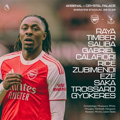 6686体育平台10月26日讯 英超联赛事第9轮,阿森纳主队场迎战水晶宫。赛前,两队首发阵容出炉。