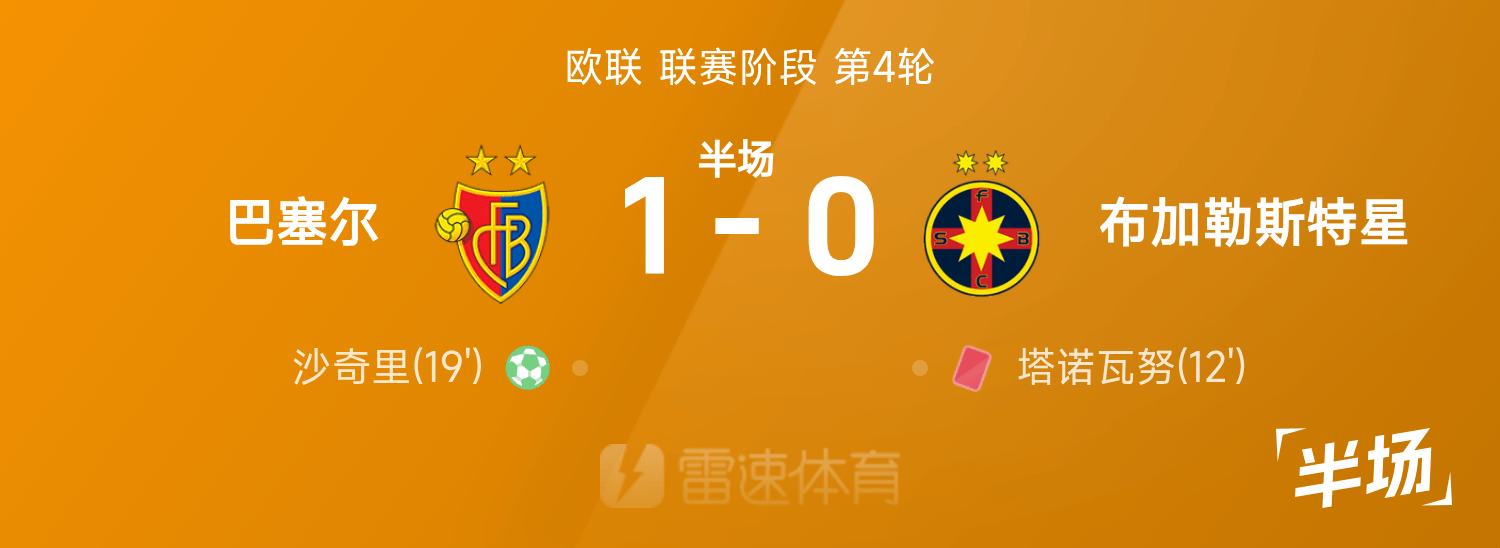 6686体育平台11月07日讯 25/26赛季欧联联赛事阶段第4轮,巴塞尔迎战布加勒斯特星。半场战罢,双方赛果分暂为巴塞尔1-0布加勒斯特星,沙奇里破门建功,塔诺瓦努染红。